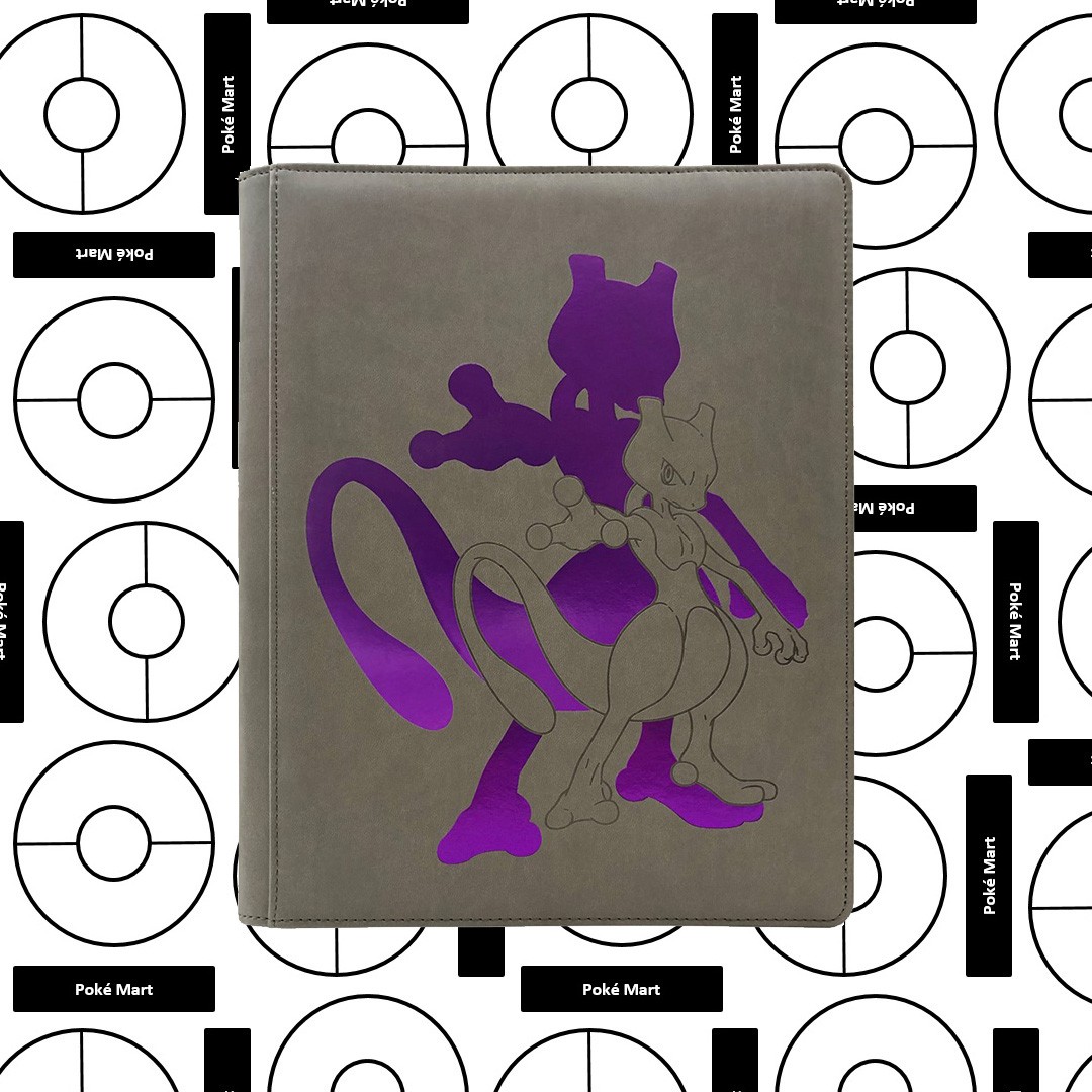 Werde zur Legende mit einem der legendärsten Pokémon aller Zeiten. Der Mewtwo Premium 9-Pocket PRO-Binder zeigt ein geprägtes Bild des Charakters über einer lila Folien-Silhouette auf einem hochwertigen, gepolsterten Kunstleder.