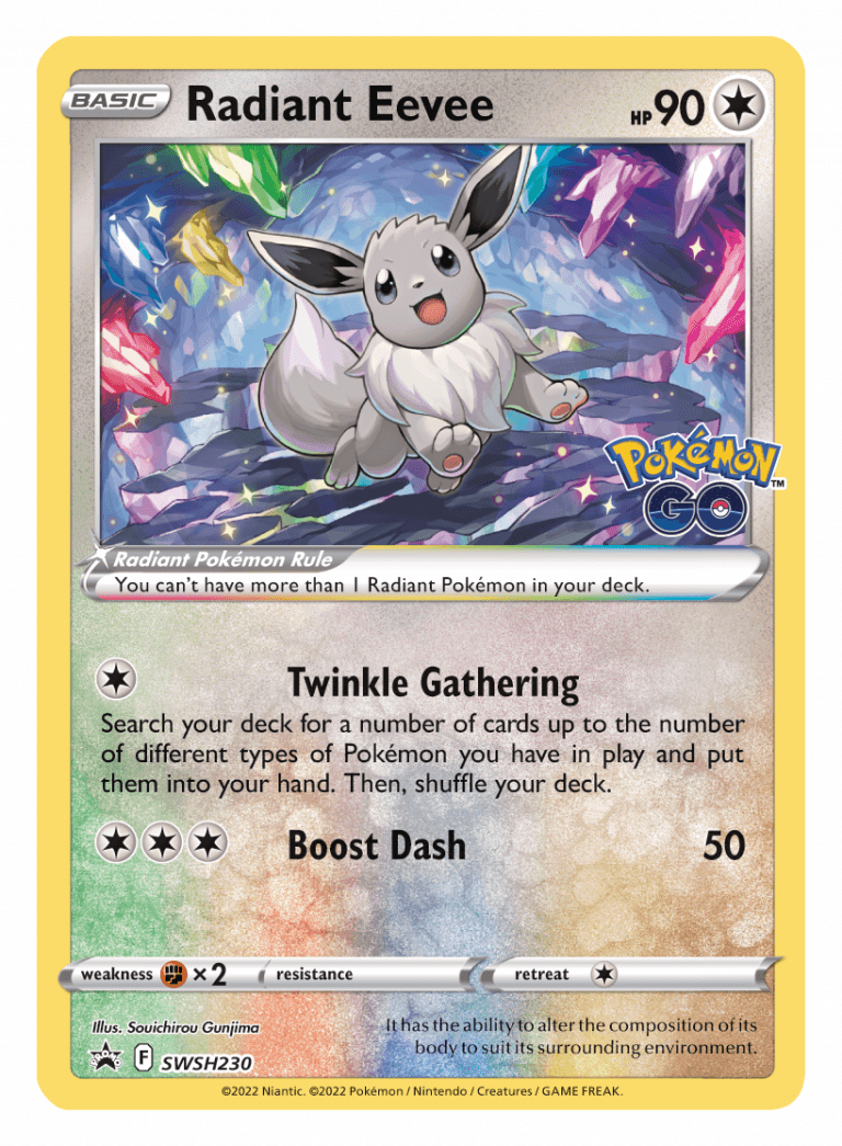 Mit ihrer einzigartigen Farbe sind glänzende Pokémon normalerweise schwer zu finden. Doch das bezaubernde Radiant Eevee freut sich darauf, deinem Team in dieser Pokémon GO Premium Collection Radiant Eevee voller Schätze beizutreten! Das Radiant Eevee, das in diesem Set als Foil-Promokarte enthalten ist, verfügt über die Attacke Glitzerndes Sammeln, mit der du dein Deck nach einer Anzahl von Karten durchsuchen kannst, die der Anzahl der verschiedenen Pokémon-Typen entspricht, die du in deinem aktiven Spiel hast. Eine solche Fähigkeit bedeutet, dass du nur ein strahlendes Pokémon in deinem Deck haben kannst.